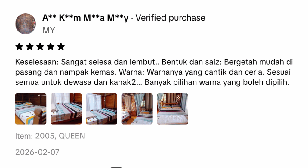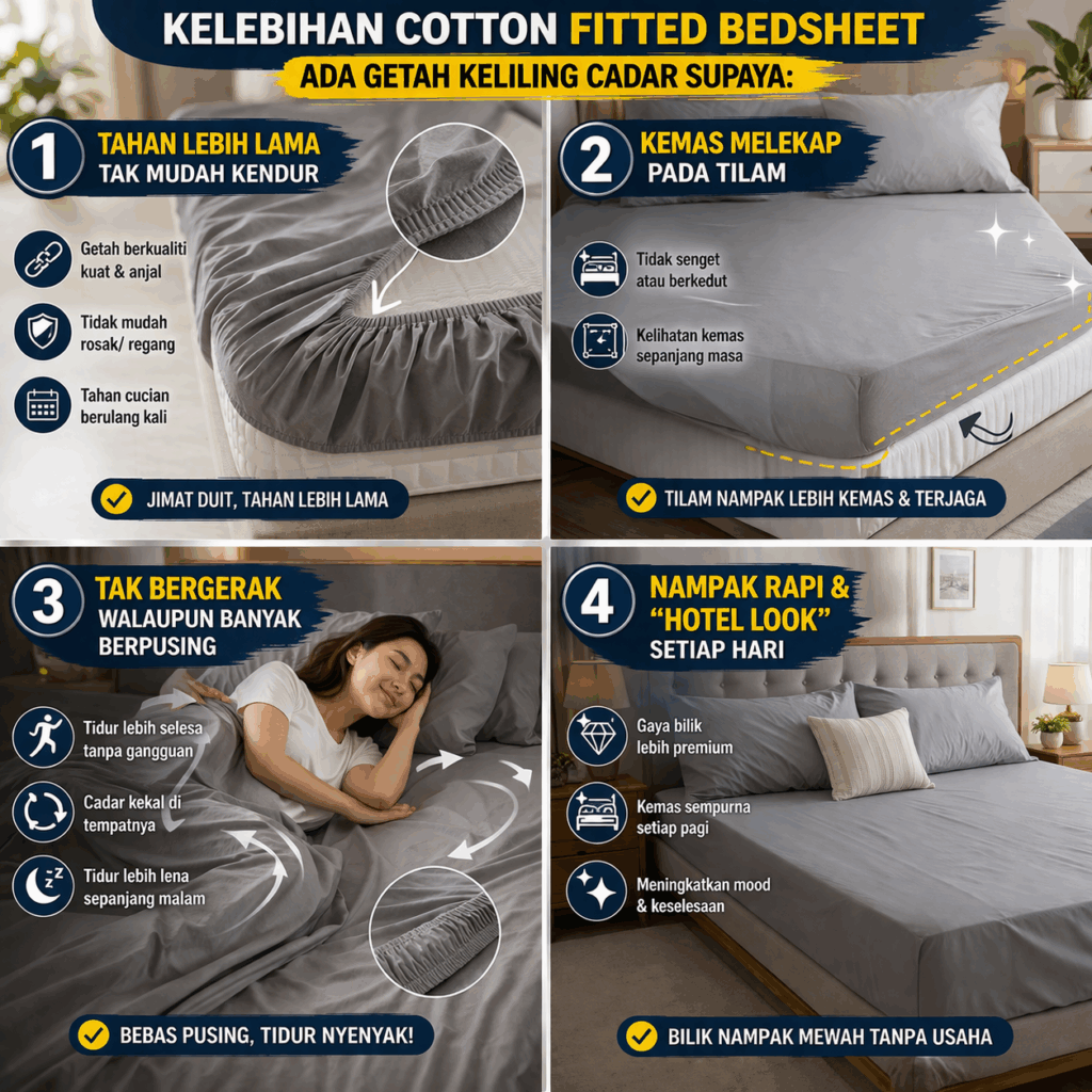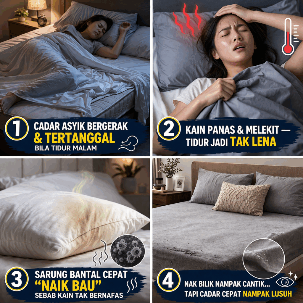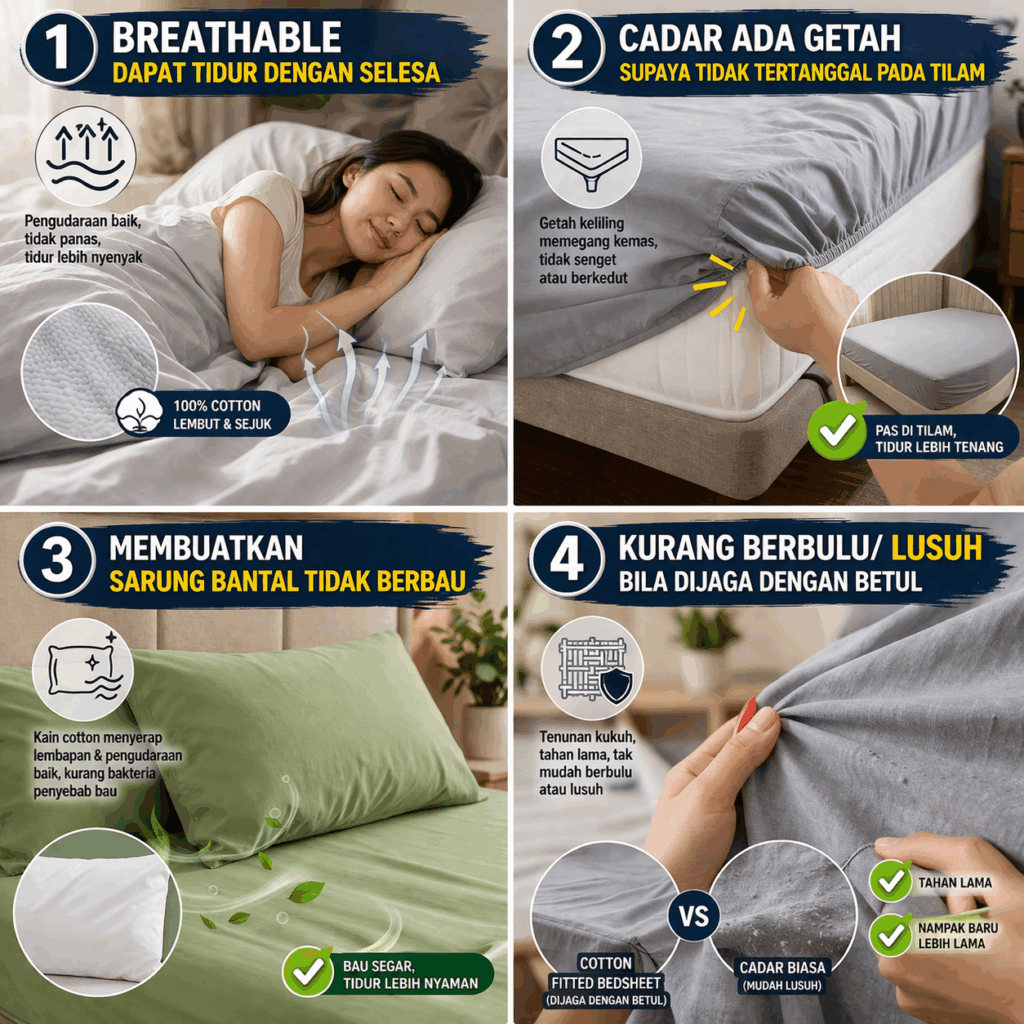 š¤ āPenat seharian⦠bila nak tidur, cadar pula asyik tertanggal & berkedut. Hilang terus mood nak rehat.ā š© Tolong Jangan Skip Page Ni !!! Perkara sebegini selalu terjadi... š Betul tak... Cadar asyik bergerak & tertanggal bila tidur malam Kain panas & melekit ā tidur jadi tak lena Sarung bantal cepat ānaik bauā sebab kain tak bernafas Nak bilik nampak cantik⦠tapi cadar cepat nampak lusuh š šØ Realitinya⦠kain cadar/sarung bantal memainkan peranan besar pada kualiti tidur Bila material kain cadar atau sarung bantal tak sesuai: badan cepat panas & berpeluh tidur asyik terjaga sebab tak selesa kulit rasa gatal/ rimas bila kain kasar Kualiti tidur kita terganggu.. Tapi Jangan Risau... Kami Ada Solusi Paling Berkesan! Cotton Fitted Bedsheet Sudah Terjual 0 Perkenalkan... š Cotton Fitted Bedsheet š“ ..Material 100% Cotton.. Cadar Tilam/Sarung Bantal yang Melekat pada tilam, lembut pada kulit, dan Kain tidak panas.... šæ Breathable ā kain ābernafasā, kurang rasa panas waktu tidur š§ Serap peluh lebih baik ā sesuai untuk cuaca Malaysia š¤ Lembut & mesra kulit ā tak kasar, tak gatal š§¼ Senang basuh & cepat kering ā tak renyah untuk harian š”ļø Tahan lama ā kurang mudah berbulu/ lusuh bila jaga dengan betul šļø Dalam satu set, boss dapat (boleh rujuk gambar) : - ā 1x Cadar katil (fitted) ā 2x Sarung bantal (matching corak) ā 1x Sarung bantal Panjang (matching corak) š Perbandingan ringkas Cadar BiasaCotton Fitted Bedsheetā Mudah tertanggalā Getah keliling, kemas melekatā Panas & melekitā Cotton breathable, Sangat selesaā Cepat nampak serabutā Nampak rapi & kemasā Sarung bantal tak matchā Set matching corak Apa Kata Pengguna Sebenar? š PROMO KHAS UNTUK ANDA Promosi Khas Hari Ini PROMO TAMAT DALAM MASA TAK PERLU RISAU BARANG TAK SAMPAI. BAYAR JE DEKAT POSMEN Kadang yang buat hidup rasa tenang⦠benda kecil macam tidur yang selesa. Bila cadar lembut & kemas, bilik pun rasa lebih āhomeā. Bertindak Sekarang!! Nak Order? Sila Isi Borang Tempahan di Bawah Cotton Fitted Bedsheet MYPakej Pakej Trial - RM49 (1 Set) Cotton Fitted Bedsheet Pakej Combo - RM69 (2 Set) Cotton Fitted Bedsheet Pakej Jimat - RM79 (3 Set) Cotton Fitted BedsheetSaiz King Bed Queen Bed Single BedModel10020102410361039104110012102910251046ALAMATNAMA PENUHPOSKODNO TELEFONNOTAPOSTAGE COD (RM10)Tempah Sekarang