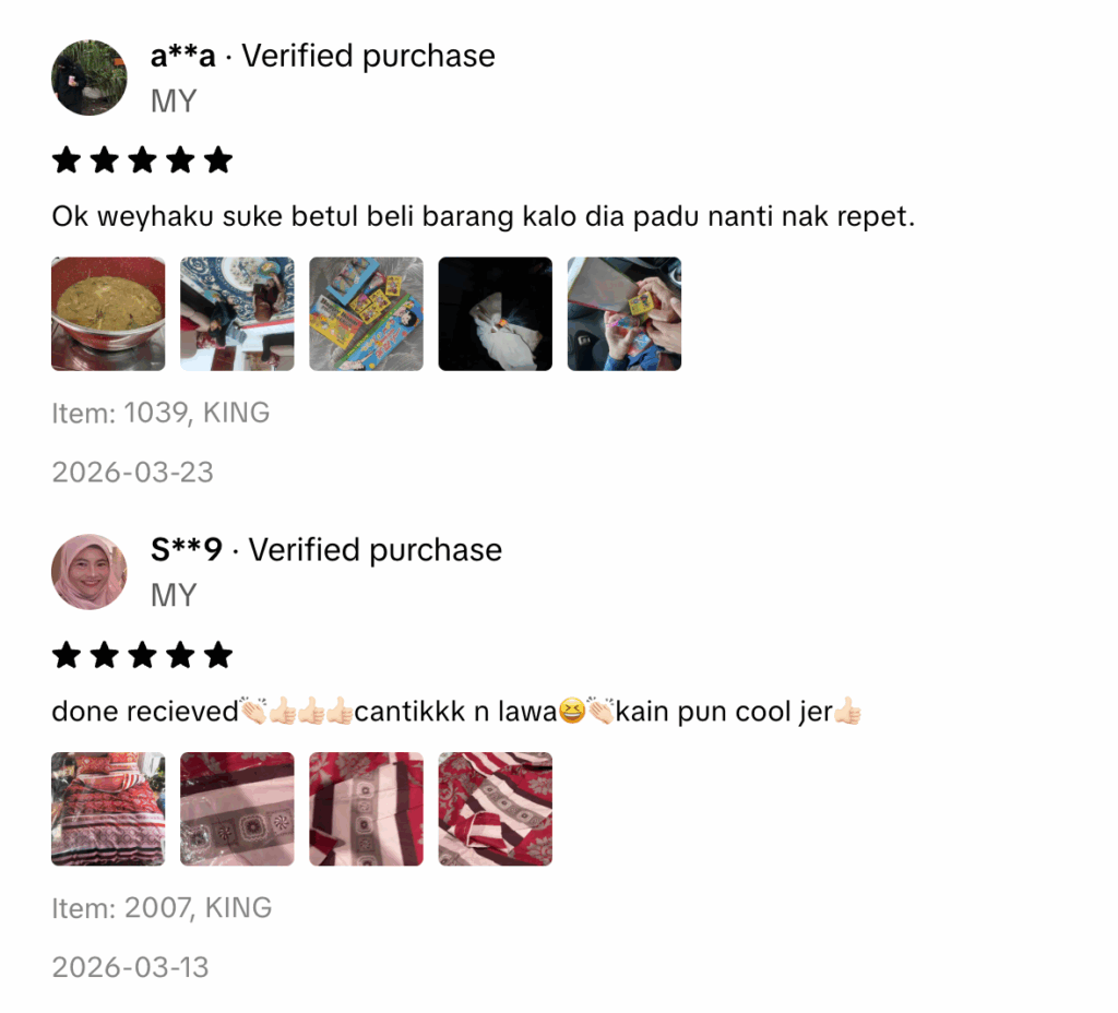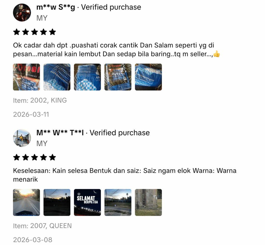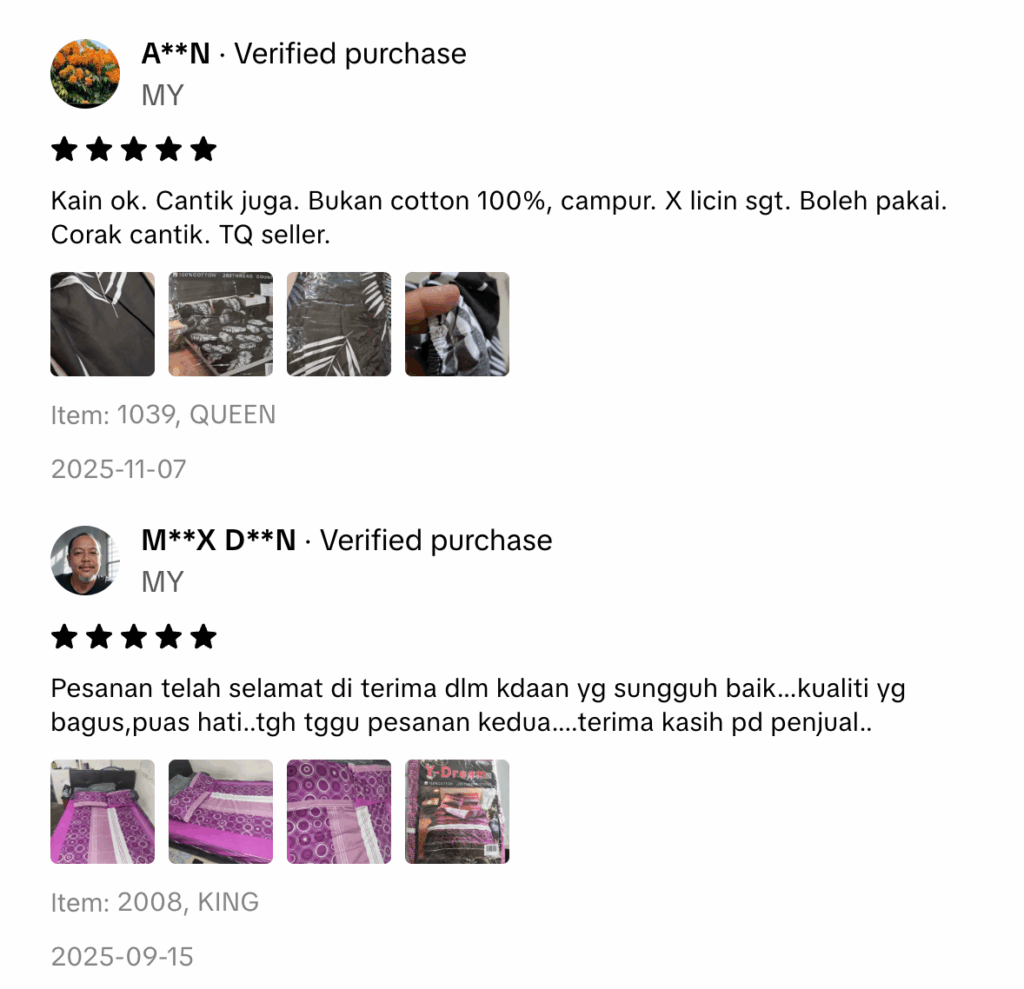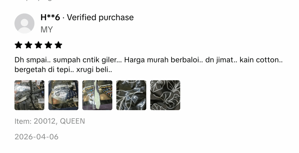š¤ āPenat seharian⦠bila nak tidur, cadar pula asyik tertanggal & berkedut. Hilang terus mood nak rehat.ā š© Tolong Jangan Skip Page Ni !!! Perkara sebegini selalu terjadi... š Betul tak... Cadar asyik bergerak & tertanggal bila tidur malam Kain panas & melekit ā tidur jadi tak lena Sarung bantal cepat ānaik bauā sebab kain tak bernafas Nak bilik nampak cantik⦠tapi cadar cepat nampak lusuh š šØ Realitinya⦠kain cadar/sarung bantal memainkan peranan besar pada kualiti tidur Bila material kain cadar atau sarung bantal tak sesuai: badan cepat panas & berpeluh tidur asyik terjaga sebab tak selesa kulit rasa gatal/ rimas bila kain kasar Kualiti tidur kita terganggu.. Tapi Jangan Risau... Kami Ada Solusi Paling Berkesan! Cotton Fitted Bedsheet Sudah Terjual 0 Perkenalkan... š Cotton Fitted Bedsheet š“ ..Material 100% Cotton.. Cadar Tilam/Sarung Bantal yang Melekat pada tilam, lembut pada kulit, dan Kain tidak panas.... šæ Breathable ā kain ābernafasā, kurang rasa panas waktu tidur š§ Serap peluh lebih baik ā sesuai untuk cuaca Malaysia š¤ Lembut & mesra kulit ā tak kasar, tak gatal š§¼ Senang basuh & cepat kering ā tak renyah untuk harian š”ļø Tahan lama ā kurang mudah berbulu/ lusuh bila jaga dengan betul šļø Dalam satu set, boss dapat (boleh rujuk gambar) : - ā 1x Cadar katil (fitted) ā 2x Sarung bantal (matching corak) ā 1x Sarung bantal Panjang (matching corak) š Perbandingan ringkas Cadar BiasaCotton Fitted Bedsheetā Mudah tertanggalā Getah keliling, kemas melekatā Panas & melekitā Cotton breathable, Sangat selesaā Cepat nampak serabutā Nampak rapi & kemasā Sarung bantal tak matchā Set matching corak Apa Kata Pengguna Sebenar? š PROMO KHAS UNTUK ANDA Promosi Khas Hari Ini PROMO TAMAT DALAM MASA TAK PERLU RISAU BARANG TAK SAMPAI. BAYAR JE DEKAT POSMEN Kadang yang buat hidup rasa tenang⦠benda kecil macam tidur yang selesa. Bila cadar lembut & kemas, bilik pun rasa lebih āhomeā. Bertindak Sekarang!! Nak Order? Sila Isi Borang Tempahan di Bawah Cotton Fitted Bedsheet MYPakej Pakej Trial - RM49 (1 Set) Cotton Fitted Bedsheet Pakej Combo - RM69 (2 Set) Cotton Fitted Bedsheet Pakej Jimat - RM79 (3 Set) Cotton Fitted BedsheetSaiz King Bed Queen Bed Single BedModel10020102410361039104110012102910251046ALAMATNAMA PENUHPOSKODNO TELEFONNOTAPOSTAGE COD (RM10)Tempah Sekarang