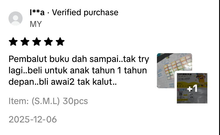 📚 “Baru sebulan sekolah… buku anak dah lunyai, koyak & hilang kulit depan."" Tolong Jangan Skip Page Ni !!! 😩 Padahal baru beli buku tu… Tapi sebab tak dibalut, terus rosak & nampak tak terjaga. ❌ Buku teks anak dah lunyai sebelum pertengahan tahun ❌ Kulit buku koyak, tercabut, basah sebab tertumpah air ❌ Anak kena marah cikgu sebab buku tak bersampul ❌ Bila nak ulangkaji – buku dah tak boleh baca, penuh contengan & kotor 🚨 Ramai Ibu Bapa Tak Sangka – Pembalut Buku Berkualiti Boleh Bantu Elak Masalah Ini ‼️‼️‼️ 💸 Buku kerap rosak → kena beli baru / fotostat 🥺 Anak hilang motivasi sebab buku susah nak baca 😒 Cikgu Risau → beri impression anak tak serius belajar 😔 Bila nak periksa → susah cari nota sebab buku dah berlipat / tercabut Tapi Jangan Risau... Kami Ada Solusi Paling Berkesan! Matte Book Cover 0 Perkenalkan... 📚 📖 MATTE BOOK COVER Pembalut Buku Sekolah – Pelindungan Praktikal, Kemas & Tahan Lama Untuk Semua Buku Anak - Anak 🛡️ Material tahan lasak – tak mudah koyak / luntur 📏 Saiz universal – muat untuk buku teks & latihan 💧 Kalis air – selamat dari tumpahan air / hujan 💡 Senang dipasang & di tanggalkan – tak perlu gam / staples & tidak merosakkan cover buku 📊 Pembalut buku biasa VS Matte Book Cover Pembalut Buku BiasaMatte book cover❌ Buku cepat rosak / lunya✅ Buku tahan setahun / lebih❌ Nampak tak kemas depan cikgu✅ Nampak Kemas & bersih❌ Duit habis sebab kena ganti buku✅ Memberi pelindungan dari air, koyak & tertanggal❌ Pembalut asik tertanggal✅ Melekat dengan kuat dan senang ditanggalakn Apa Kata Pengguna Sebenar? 🎁 PROMO UNTUK AWAL TAHUN SEKOLAH Promosi Khas Hari Ini PROMO TAMAT DALAM MASA TAK PERLU RISAU BARANG TAK SAMPAI. BAYAR JE DEKAT POSMEN “Anak semangat belajar… bila buku nampak kemas & tersusun.” 📘✨ 🔥 Klik Sini Untuk Dapatkan Pembalut Buku Sekolah Sekarang! Nak Order? Sila Isi Borang Tempahan di Bawah Pembalut Buku MYPakej Small Pakej Small 10 Pcs- RM39 (1 Pack)Kuantiti SmallPakej Medium Pakej Medium 10 pcs- RM44 (1 Pack)Kuantiti MediumPakej Large Pakej Large 10 pcs - RM49 (1 Pack)Kuantiti LargeNAMA PENUHALAMATPOSKODNO TELEFONNOTAPOSTAGE COD (RM10)Tempah Sekarang